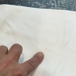 * Notable flaws include a small yellow stain on the front and a minor hole near the left side seam, both pictured.