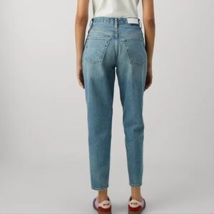 Ultra high rise fit sitting at the natural waist with ankle length inseam. Fitted at the top with ease at the seat and hip tapering towards the leg opening. This style is a rigid denim with no stretch just like your favorite vintage jeans