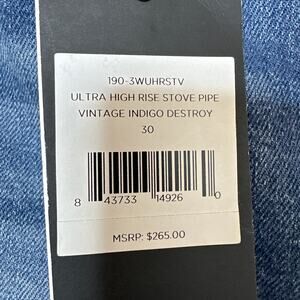 Details: The Ultra High Rise Stove Pipe in Vintage Indigo Destroy is our version of the classic 70s-inspired straight-leg jean, meant to hit just above the ankle. Features a destroyed indigo wash, a classic button fly, and a casual raw hem.