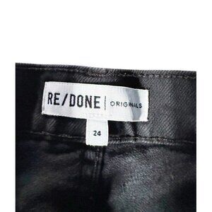 Re/Done women's black denim high waist ankle skinny jeans. Jeans have a button fly and a white leather logo patch on the back. They're made of a cotton elastane blend and are a woman's size 24. Made in the USA.