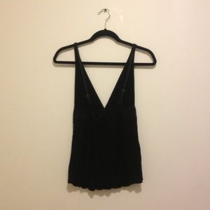 Sexy black top with a low V neck and a lace band that extends all the way around for a peek of skin. Adjustable straps, slightly flared sides. Great look!