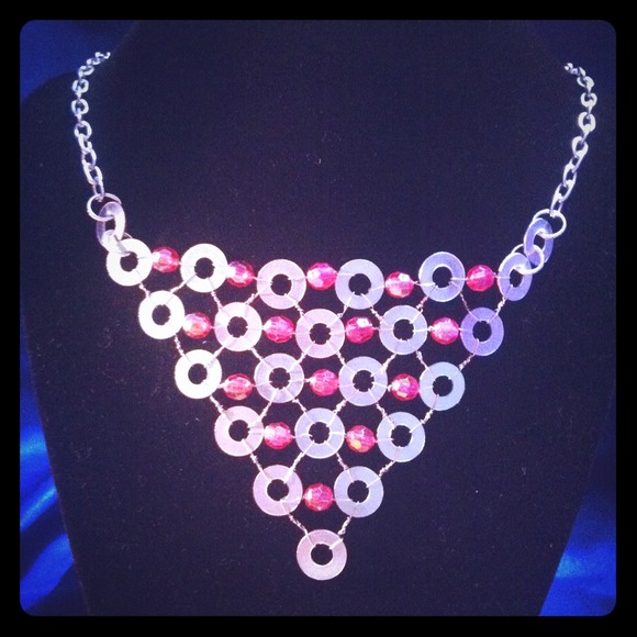 Handmade silver washer and pink bead bib style necklace. Lightweight