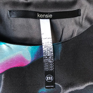 This multicolored fit-and-flare dress by Kensie is perfect for fall with its vibrant color palette of cool shades like teal paired with magenta. It is in good preowned condition. Originally purchased from Belk. Lined. Side zipper.