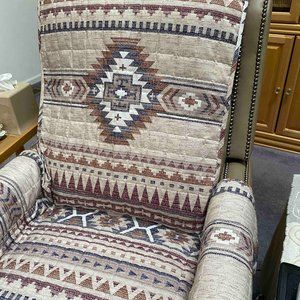 Lone Star chair cover in "Southern Flare" design in sand, navy, rust, and brown. Reversible polyester, machine washable. 81" total length top to bottom, 81" total width (including arm covers). Used for about a month, in perfect condition.