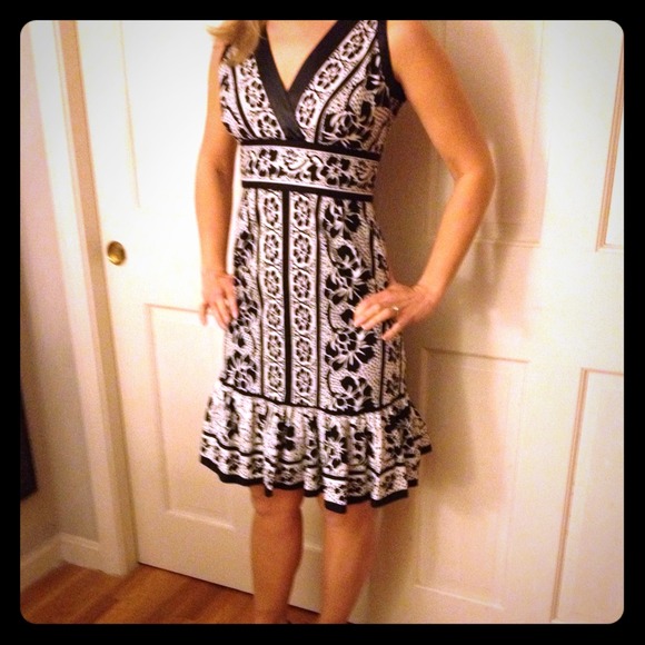 Adorable dress with contrast waist pattern. Deep V in front and back with silky black fabric hem. Very comfortable. Side zip, unlined. Worn to one event. Sad to part with it, but I rarely wear a dress twice.