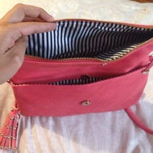 A pink crossbody purse with a little tassel and gold looking hardware. Adjustable and removable strap length! Can be a handheld bag too! Black & white striped interior. 1 pocket inside, 1 outside. Only flaw is the small pen marks shown in last pic but it folds over so you can't see while wearing it. Super lovely bag. Perfect for Spring/Summer☺️❤️