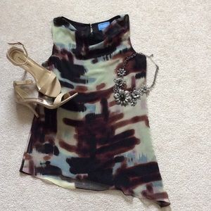 Versatile sleeveless tunic with slight cowl neckline in an abstract tan, rust, blue and black print. From yoga pants to distressed denim, this is a perfect topper.