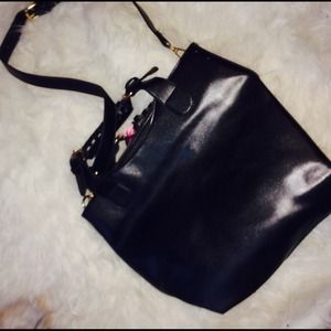 This pretty black leather handbag features gold hardware and tie detail around the handles. Has a removable shoulder strap but the structure of this bag is what makes it special.