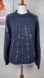 FRNCH dark blue sweater. High mock neck. Long blouson sleeves. Ribbed ends and hem. Cerulean blue sequin stripes on front and sleeves. Worn and in great condition.