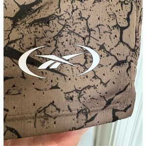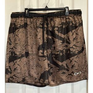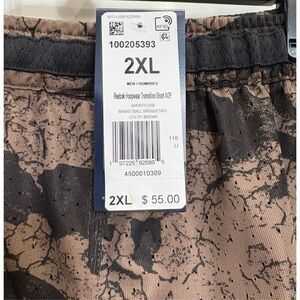 Reebok Men's 2XL Casual Hoopwear Transition Basketball Shorts. MSRP $55. These are brown with a unique black pattern and they have an encased elastic waistband, along with a drawstring. Roomy side pockets and Reebok logo on left bottom. They're 100% polyester, so machine wash (cold) and tumble dry (cool). The waist circumference is 40" (without stretching, the rise is 14" and the inseam is 7". These are comfortable and trendy and NWT!