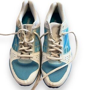 Reebok online had a pick your own color option for awhile, these lovely blues were custom picked for mom. She only wore a few times and now they don’t go over her leg brace. Like new! See the mesh upper and the sole which is designed to grip surfaces for stability.
