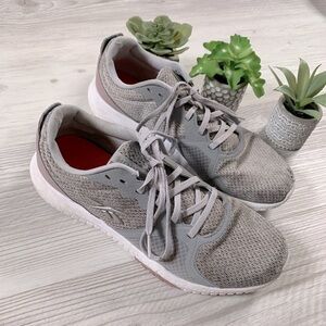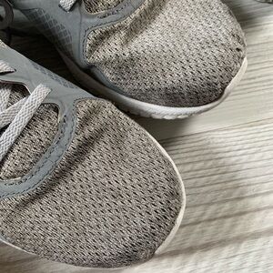 Reebok Flexagon Force running shoes. Memory Tech footbed. Designed for performance/circuit training. Breathable mesh upper fabric. Grey lace up closure. Cold grey and lilac fog. Orange footbed. White and lilac sole. Womens size 10. Wear at each interior heel and minor damage to mesh at tips of toes. Imperfections shown in photos. No shoebox included.
