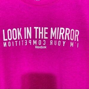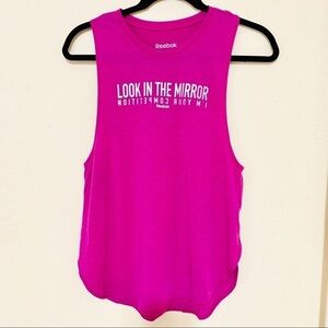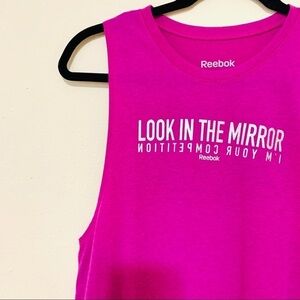 Reebok Drop Armhole Heather Look in the Mirror, I'm your Competition Graphic Tank Top in fierce fuchsia heather.