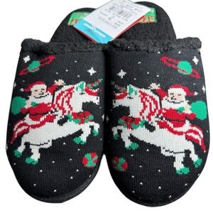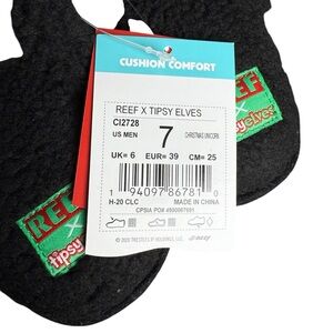 The REEF Collab Tipsy Elves Mens Slippers in size 7 bring a whimsical touch to your holiday season with their Christmas Unicorn design. These slip-on slippers feature a round toe, flat heel, and cushioned comfort, making them perfect for lounging in style during the winter and fall seasons. The black synthetic upper, fleece lining, and Santa pattern add a festive flair to your casual attire. Ideal for men looking to add a touch of holiday cheer to their wardrobe, these slippers are sure to bring joy and comfort to your feet.