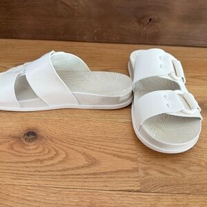 This chunky, built-up look is a must, as is the amazing cushioned comfort. With nature-inspired details and soft vegan leather straps in a classic two-bar buckled design, this sandal will serve you from day to night in easy, casual chic style.