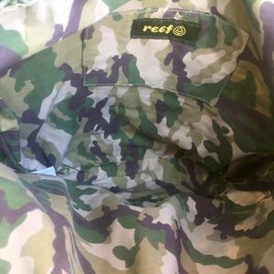 REEF "Monaco" Raffia tote/shopper in moss green, large woven crochet size, lined in a cotton camouflage pattern, closure is a satin tie.