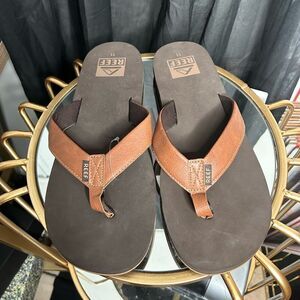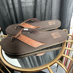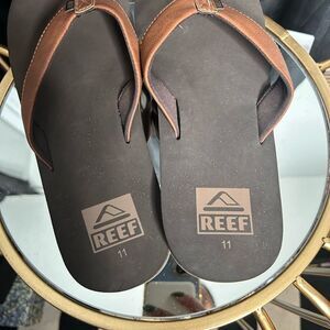 Size 11. Like new. Have some small white dots all of the footbed. Reef Twinpin flip flops. Faux leather upper with jersey lining. Reef flex triple density EVA footbed and outsole. Imported.