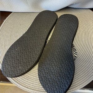 Reef black soles with a black and white zebra T-strap on these flip flops. Excellent treads. Lightly used, size 10