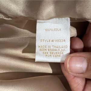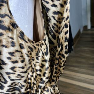 Reem Bridals, fabric content:100% silk, silk lined, cheetah animal print, color: gold/black, waterfall neckline, elastic waist, back cape, short dress. Preowned no rips, tears, or stains. Please see pictures for details.