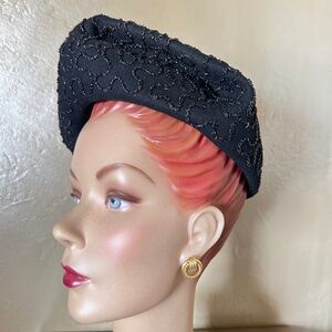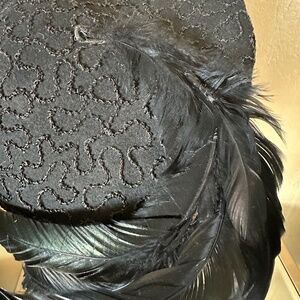 This black felt "beret" from the fabulous 1940s' consists of an irregular triangular shape without a crown. There are indentations on the sides, and the entire hat is adorned with undulation strips of shiny cord, offering a very striking look. To complete this look, there is a large spray of iridescent black rooster feathers projecting backwards. This is such an elegant look!