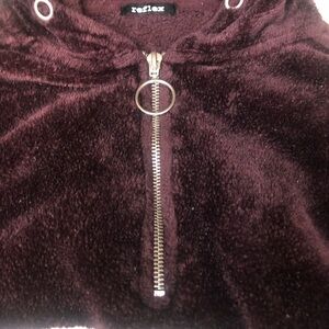 Reflex maroon and white half zip hoodie, small, soft fleece material, silver zipper, missing drawstring on hood, front pocket.
