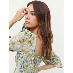 REFORMATION 90s Sage Floral Crepe Square Neck Ruffle Puff Sleeve Smock Dress XS