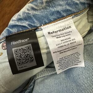 The REFORMATION Cary Jeans in women's size 31 are a stylish and comfortable choice for any season. Made from rigid denim fabric with a relaxed fit, these wide-leg jeans feature a low rise and a 31.5-inch inseam. The classic blue color and 5-pocket design add to the timeless appeal of these trousers, making them a versatile staple in your wardrobe. With a zip and button closure, these jeans are easy to put on and take off, while the cotton blend material ensures a comfortable feel throughout the day. Perfect for various themes including college, city, 90s, and hip hop, these Reformation jeans are a trendy choice for any outfit.
