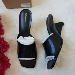 Wedge curved heel, square peep toe, black bovine leather with lustrous patent finish.