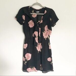 Features: black with pink florals, v neck, button up (3 buttons), mini dress, Fraser style, short sleeve, collar, open slit in back, zippered back, cinched waist