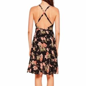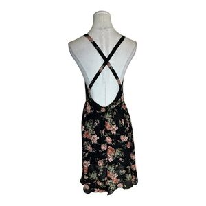 Beautiful dress. Criss cross back. Zips up the back. Open back. Roses. A rayon feel. Lined. No size but fits like a small to medium. Size tag removed. Please see measurements below to confirm that it will fit. Measurements laying flat (unstretched and approximate inches)