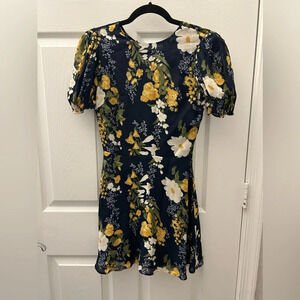 Fabric: Lightweight, non-stretch crepe Short puff sleeves with smocked elastic cuffs Ruffle trim Floral print Hook-and-eye and hidden zip at back Shell: 100% viscose Lined