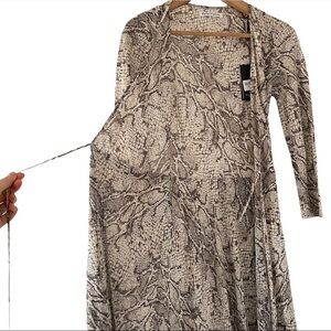 This is a midi length, wrap dress with a v neckline, 3/4 length sleeves and a high slit.