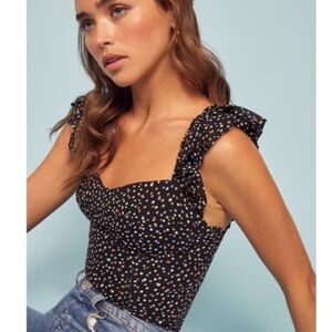REFORMATION Lisbon Ruffle Shoulder floral print Top. Sultry and sweet, this shapely crop top features a bustier-inspired neckline, frilly shoulders and a flattering close fit. Runs small; order one size up. Sweetheart neck, Ruffled shoulders, Lined front, 100% viscose, Dry clean. In good condition, minimal wear. No holes/stains.