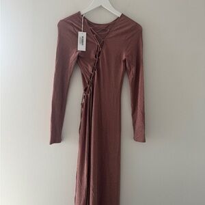 Lace me up. The Kinsey is a long sleeve, midi length dress with a crew neckline. It features an asymmetrical cut out at the back that wraps around to the waist. It has a functional lace up detail so you can show off your figure.