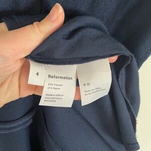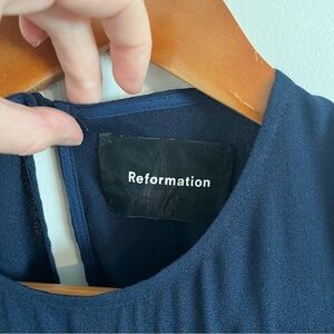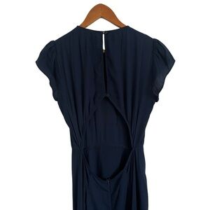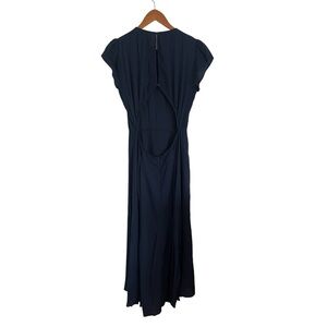 REFORMATION Navy Cap Sleeve High Slit Gavin Midi Dress. Open back with cutouts and button detail. Hidden zipper/ Side front slit.