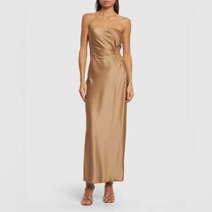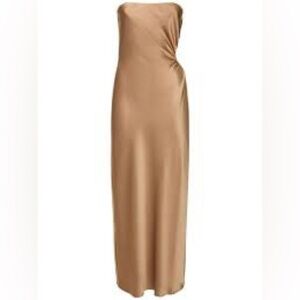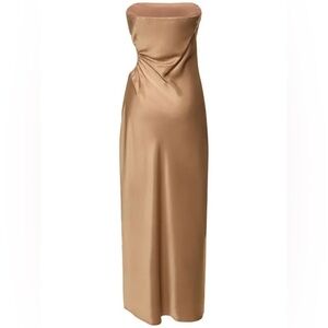 This midi dress features a strapless silhouette, a side cutout detail and is crafted from smooth satin.