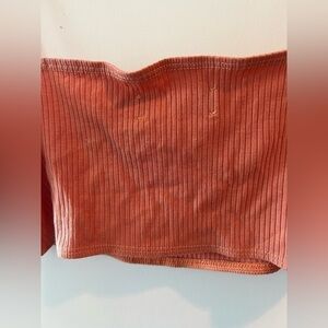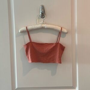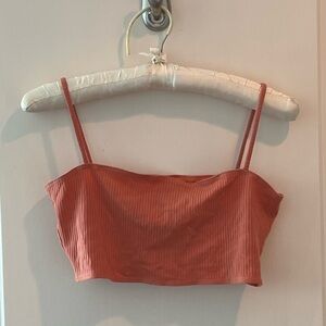 Features: ribbed, bandeau top, crop top, spaghetti straps, stretchy.
