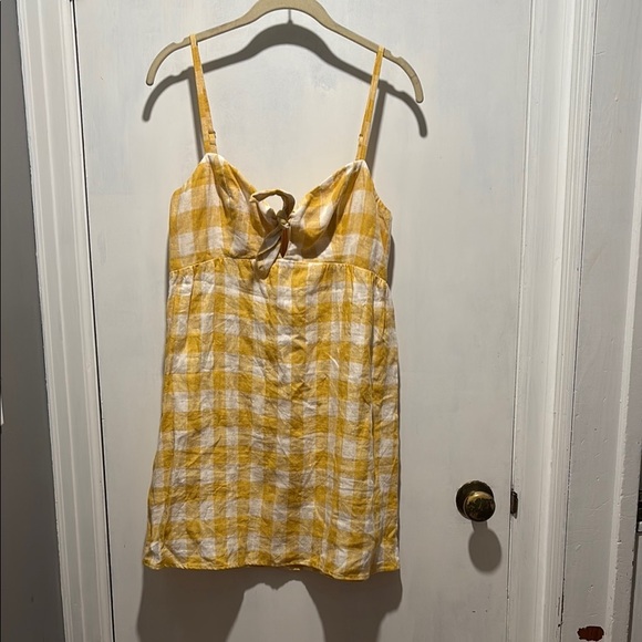 Reformation Ryland mini gingham dress with tie keyhole at chest. Back zipper. 100% linen, no callouts.