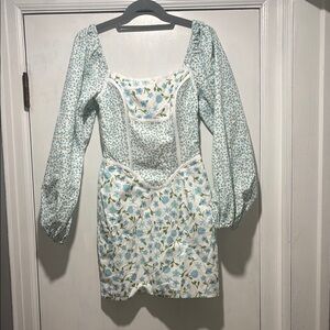 Reformation brand Doutzen dress in Leona floral style. Ruffle sleeve and hem, slight puffy shoulder. A whimsical and romantic floral pattern pairs nicely with the blue background. No callouts, in new condition. Stock photo added for reference from the website. Tags: event, date night, feminine, floral, special occasion
