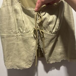 Reformation linen tank top in a mint ish green. Lace edges and two ties in front. The style of the shirt will leave your stomach partially exposed. No callouts, in great condition. Structured support for your chest.