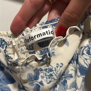 Reformation Alfred floral jumpsuit. No callouts to note, just wrinkled. Tie sleeves and zipper in the center back. Stock photo added for reference.