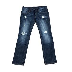 Dark wash distressed cropped denim jeans from Refuge in size 3. The brand logo has been removed otherwise great used condition.