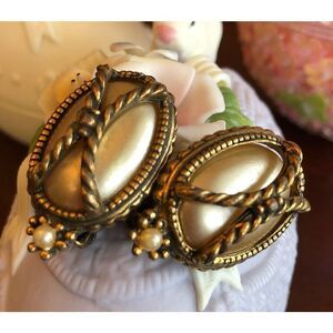 REGAL Vintage (1990) Gothic–Style Oval Faux Pearl Chunky Clip-On Earrings.  They have an ornate brass crisscross detail over the large oval faux pearl with a tiny faux pearl accentuating the bottom. They’re 1.38” long and nearly 1” wide. They have had one owner (me) and they are in excellent vintage condition. A beautiful statement piece!