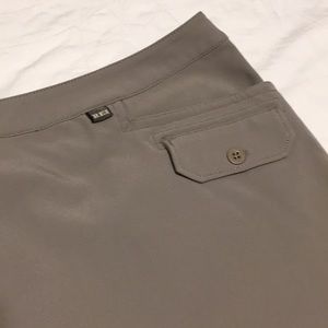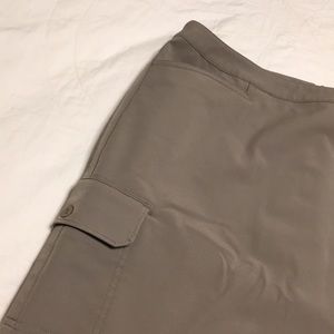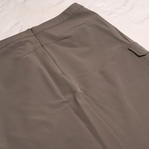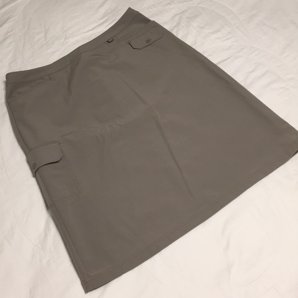 GUC R.E.I. above knee hiking skirt. Size 10, dark khaki, 94% Nylon, 6% Spandex, machine wash cold, tumble dry low. 3 roomy pockets and one cute key pocket. UPF 50+ protection! Barely noticeable white paint on back hem—see picture. Measures 16” at waist, 22.5” length.