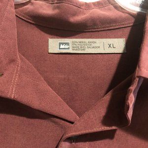 Preowned and previously worn. Clean with no rips, tears, or stains (one minor stain on the inside of the right shoulder. REI brand. Burgundy color. Button up short sleeve shirt. 83% Modal Rayon, 17% Polyester. Made in El Salvador. Size XL. RN#37249. Men's Adventure Shirt, Relaxed Fit.