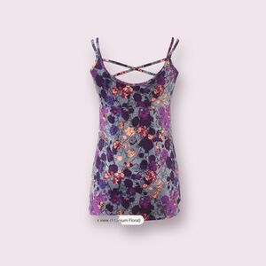 The REI CO-OP Sariska Print Bra Top Tank Tunic is a women's activewear tank top with a sleeveless, cross cross back straps design, V-neckline and an asymmetrical front. It features a pullover closure and is available in size 8. Chest measurements- 36 inch. Has removable bra pads. The tank top comes in the color titanium floral- a gray base with, purple, and orange floral print and has a regular fit. It also has built-in bra support and is easy to care for. Actual top on my gray mannequin.