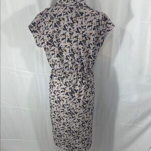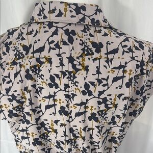 Functional yet stylish REI Cooperative sheath dress with button front and tie waist detail. Features a collared neckline, cap sleeves, and a straight sheath cut for a flattering silhouette. Designed in a lightweight woven fabric with an abstract navy and mustard floral print over a beige base.