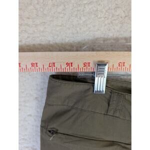 The product is a pair of REI women's pants in size 14, featuring a solid green color and a straight leg style. Made from a blend of spandex and nylon, these convertible pants have a button closure and a mid-rise fit. With a waist size of 34 inches, they are machine washable and have a 31.5-inch inseam. Perfect for travel and casual occasions, these lightweight and stretchy pants also offer a variety of features such as pockets and easy care fabric. The chino style pants are versatile enough for a range of themes including hippie, outdoor, and modern.