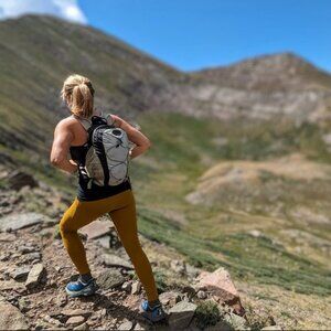 Active Pursuits Ribbed Tights from REI CoOp in a women's size Small. Golden Olive color was the official color from REI but it reminds me of a golden raisin color. Normal wear from use and wash.