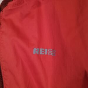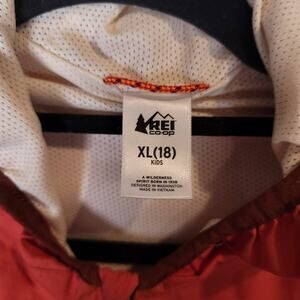 Lightweight Hooded Full zip REI Kids Size XL 18 Rain Jacket. Slightly worn 8/10.. Material is 100% polyester-burnt orange in color with a cream color inside.
